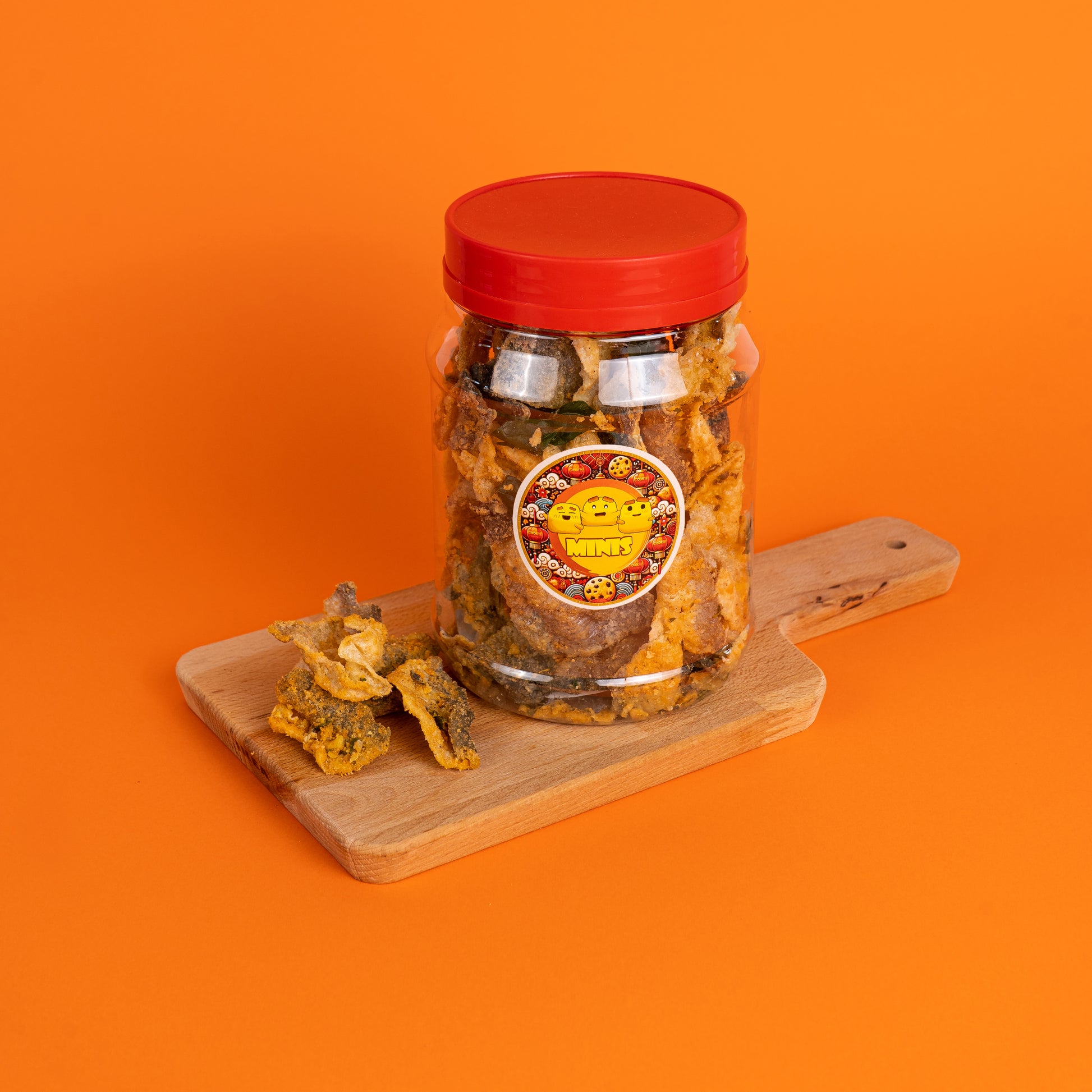Crispy Fish Skin with Salted Yolk is a popular and indulgent snack made from fish skin, deep-fried to a crispy texture, and coated with a rich, savory salted egg yolk sauce. This snack is beloved for its bold flavors and satisfying crunch, making it a favorite during Chinese New Year and other festive occasions.
